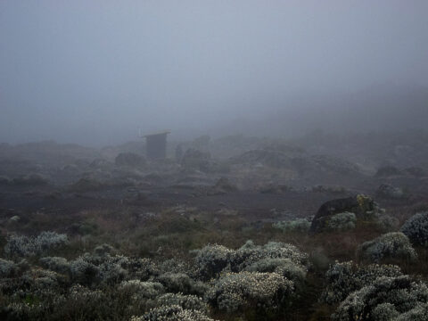 By the time we pulled up into Shira camp, a fog had rolled in and everything was looking very swampy and eerie. Looks like we got in just in time, ‘cos it started to rain about this point. However, it was only mid-afternoon, so we had to amuse ourselves for a bit before dinner. James had gone off to pass out already, so I went toilet-exploring with Gemma and Katherine.